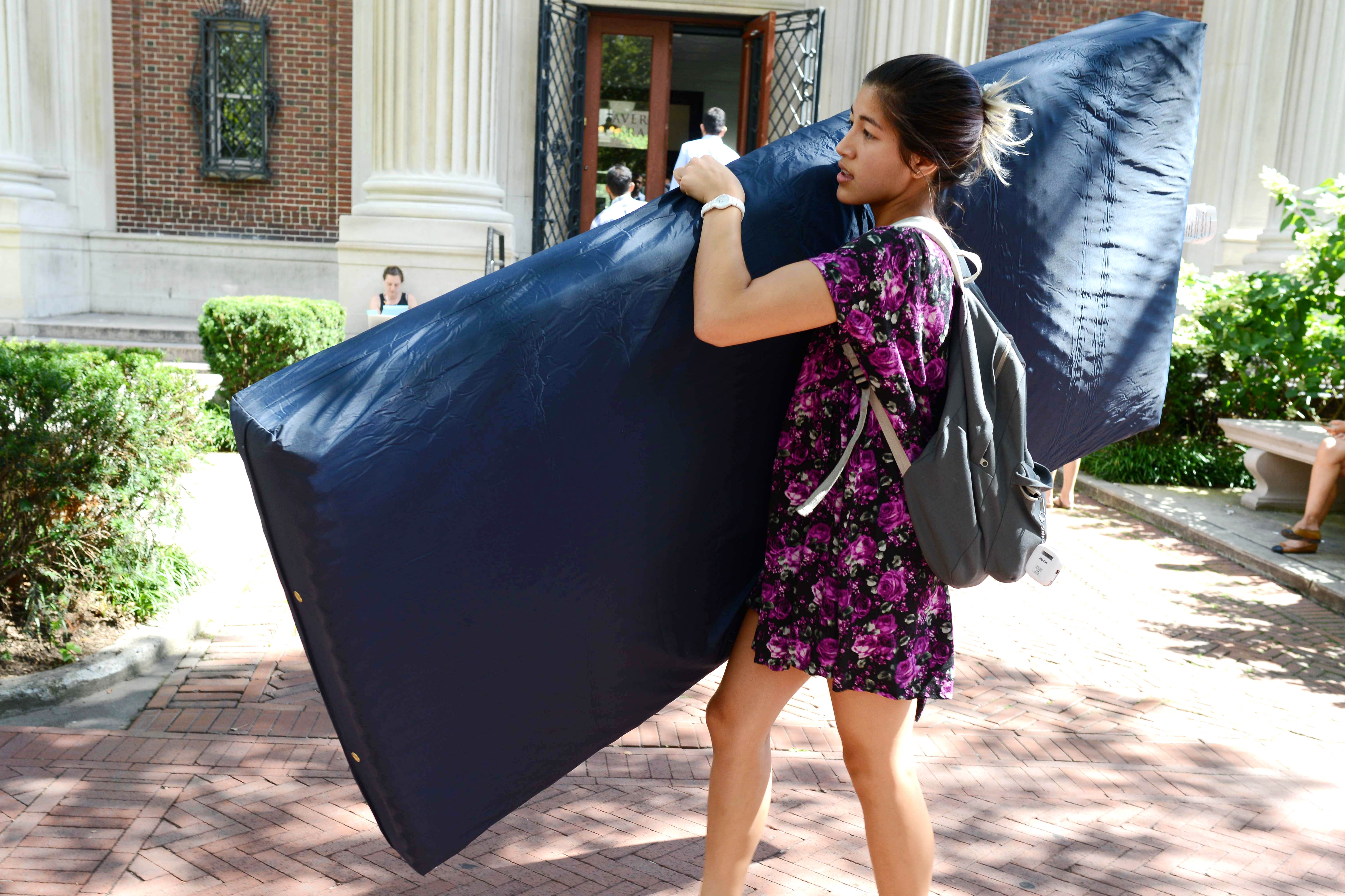 Columbia student Emma Sulkowicz has been carrying her mattress around campus as a "performance art" piece to call attention to the fact that her rapist hasn't been expelled. Emma is scene carring her mattress to class on Wednesday Sept. 3, 2014. Photos by Kristy Leibowitz.