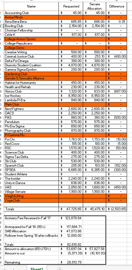 Props to The Insider staff for putting everything together for this article. There is a lot of information to sort through! Shout out to Joey from the Courts who interviewed me! One side note, SGA gets its money from the Activities Fee, which SAB does too. SGA doesn’t allocate SAB money, both groups share percentages of the Activities Fee, which SAB uses for their activities and SGA uses for campus development and club allocation.