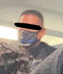 A Pitt-Greensburg Police Officer wearing a mask featuring a Thin Blue Line flag while on duty this semester.