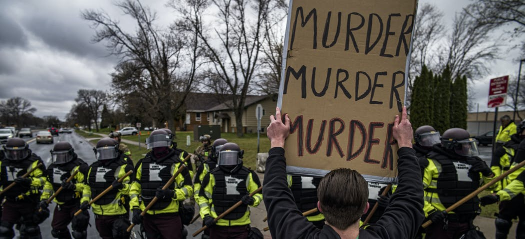 Photo of a protestor approaching a line of Minnesota State Troopers outside of the Brooklyn Center Police Department by Richard Tsong-Taatarii for the Star Tribune.