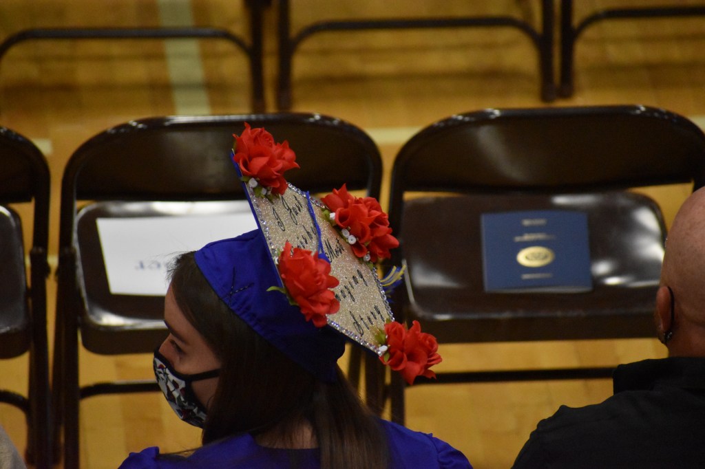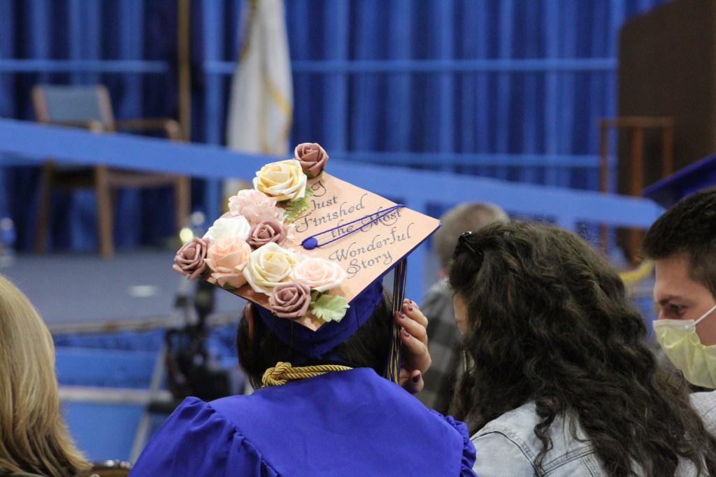 Courtney Cambal, who graduated with Summa Cum Laude honors and a Bachelor of Science in secondary education, talks with family before the ceremony. Her cap reads: “I just finished the most wonderful story.”