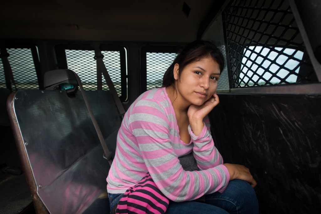 A 16-year-old illegal immigrant from El Salvador sits in a Border Patrol vehicle after being apprehended in McAllen, Texas. Once processed, she was transported to Virginia to be united with her mother.