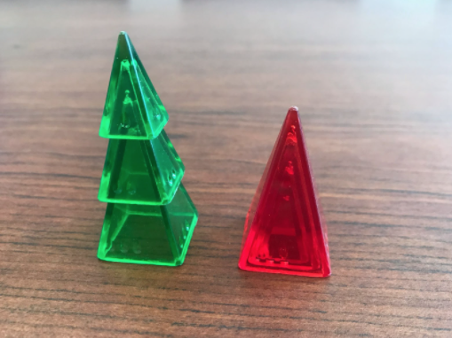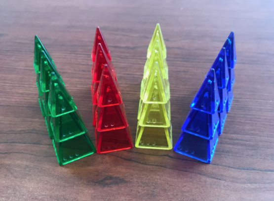 Much like how playing cards have terms like “hand” and “deck,” Looney Pyramids come in “trios” of one small, one medium, and one large pyramid of the same color.