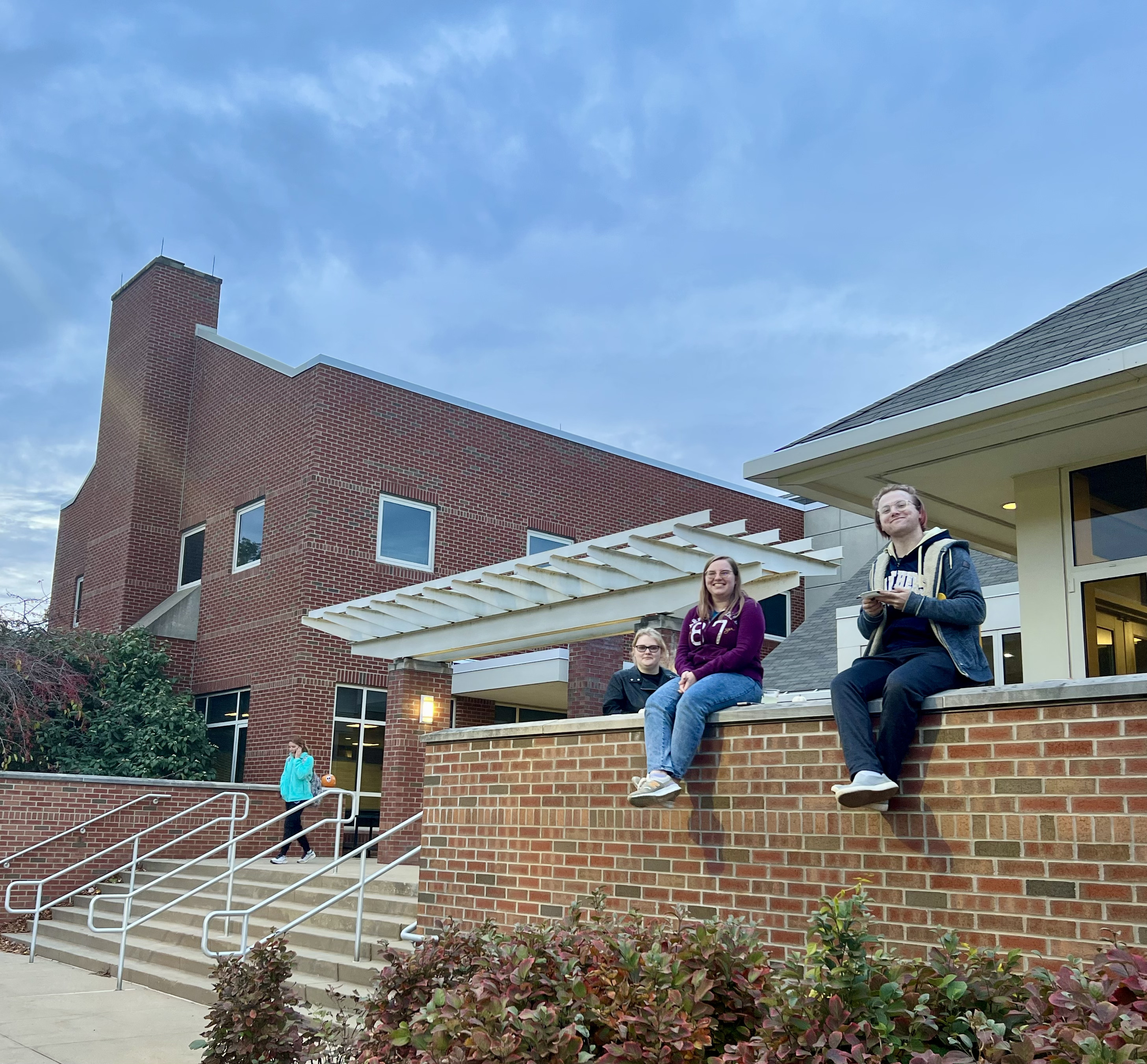 Elle O’Donnell (Psychology major), Julia Hills (Creative and Professional Writing major) and Liam Yates (Natural Science major) sit atop a ledge on Chambers Hall walkway