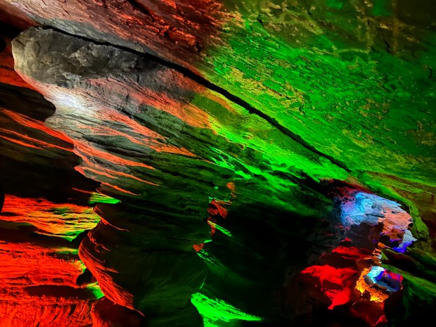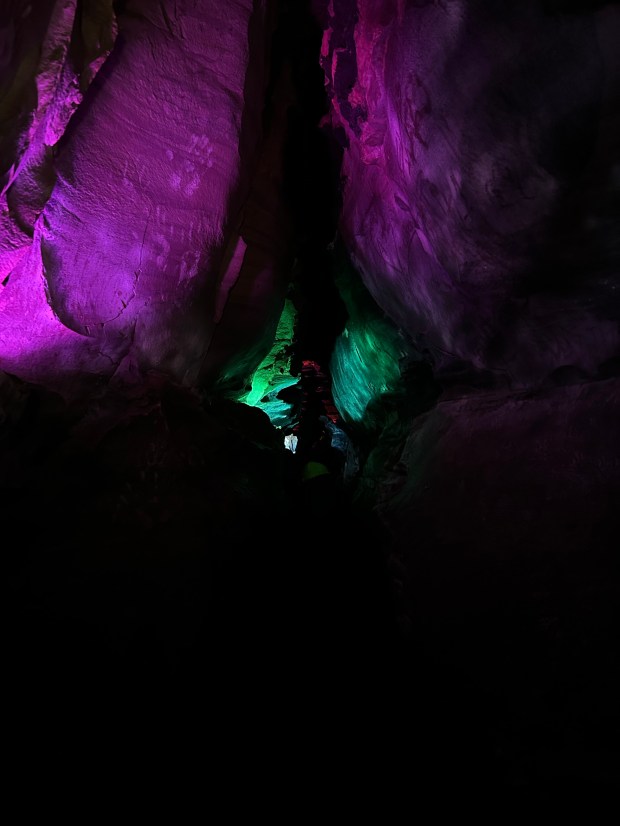 Finally, Daniel leads us over to a dark “room” just past the cave exit that tapers off into a craggy tunnel. He instructs us to turn off our lights one last time, provides an epilepsy warning, and pushes a button. The room falls dark. An aged voice recording booms:
