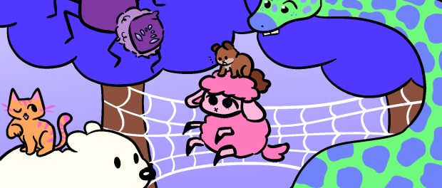 On a warm, sunny day, it seemed like a normal day in the Gerald Jungle. Poppy the Sheep was just walking around, minding her business until something terrible happened. She walked right into one of Sabrena’s big webs that was strung between two trees with big blue leaves. She usually makes them over on the bushes who turn into hedgehogs.