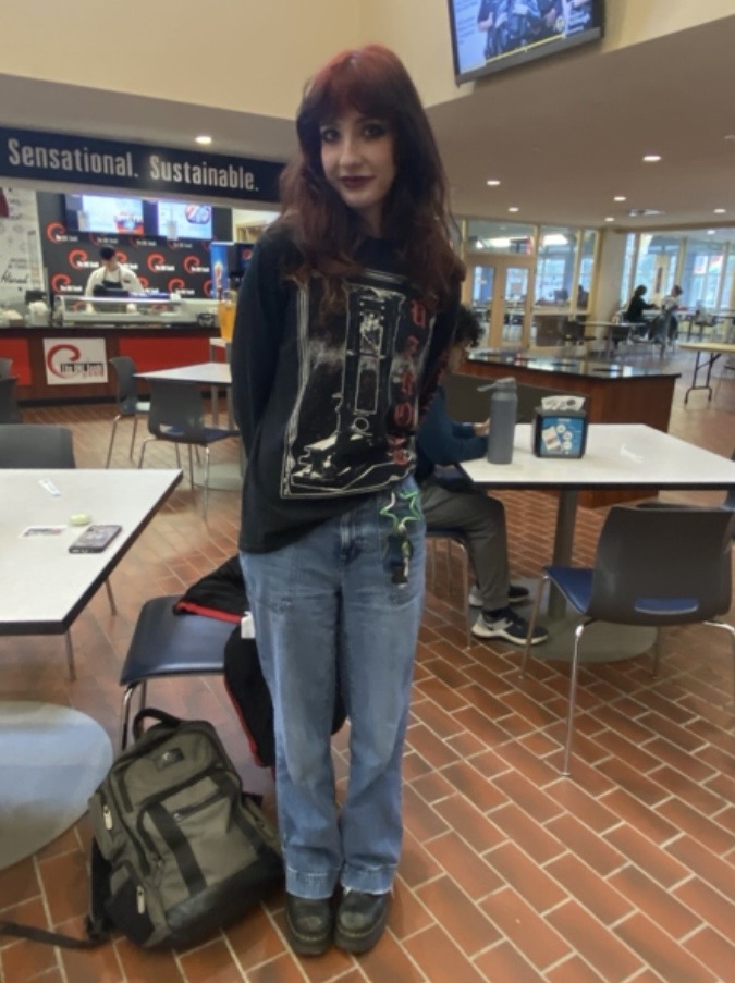 “So, this is a band t-shirt that I got from a concert at my favorite local Pittsburgh venue, the Shred Shed. Shout out. It’s Uscos. It’s a punk band. And actually, the music kind of sucked, but I really like the shirt, so I got the shirt. My pants are from Target, and then I’m wearing Doc Martens. I actually usually wear a ton of jewelry, and I’m not wearing any today, so…”