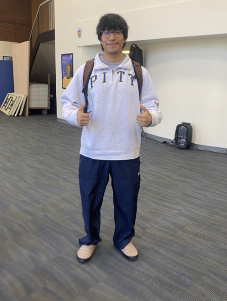 “Honestly, it’s a comfy fit. It’s kind of warm out, and the pants are super light, super breathable, so I’m not over-sweating walking to class. I walk to Powers every day. Those stairs make me sweat.”