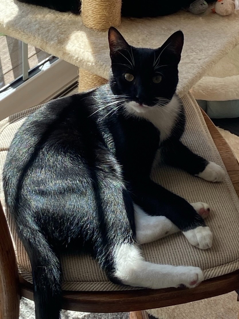 And finally, we have Benji, who is our only male cat, and he has black and white fur, and he’s about six, maybe seven now.